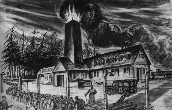 Auschwitz II-Birkenau: colonna di deportati in cammino verso il Krematorium III in funzione di David Olère, 1945